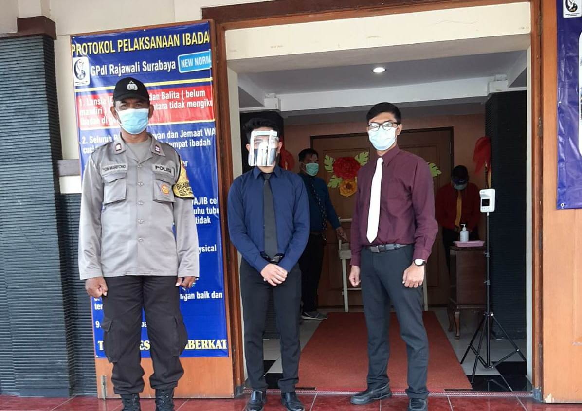 Seputarperak.com- Pengamanan kebaktian dilakukan Aiptu Marijono, Babinkamtibmas Perak Timur, Polsek Pabean Cantikan, Polres Pelabuhan Tanjung Perak di Gereja Pantekosta, Jalan Rajawali, Minggu pagi, 20 Juni 2021.