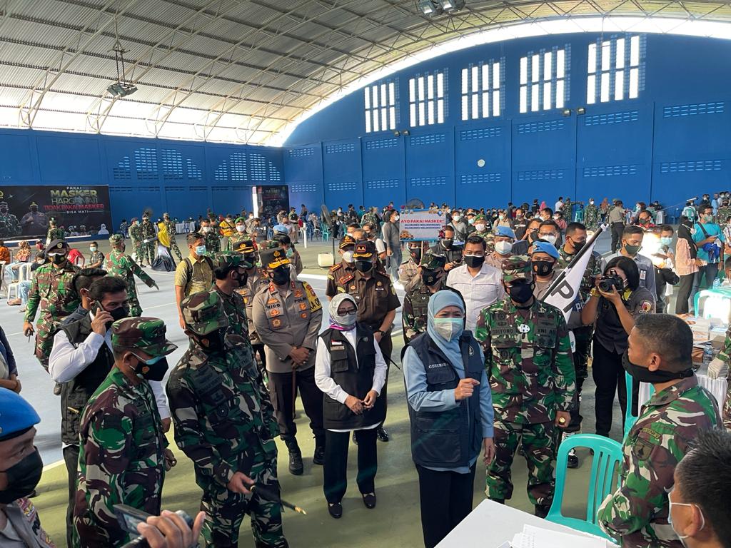 Gubernur Jawa Timur Khofifah Indar Parawansa, Pangdam V Brawijaya Mayor Jenderal TNI Suharyanto, Panglima Komando Armada II (Pangkormada II) Laksamana Muda TNI Iwan Isnurwanto, dan Kapolda Jatim Irjen Pol Nico Afinta, serta didampingi Kabinda Jatim Marsma TNI Rudy Iskandar, Sekda prov, Pejabat Utama Polda Jatim, Pejabat Utama Kodam V/Brawijaya, Forkopinda Jombang dan Kapolres Jombang melakukan pengecekan serbuan vaksinasi yang berlangsung di Gedung Tenis Indoor Jombang.
