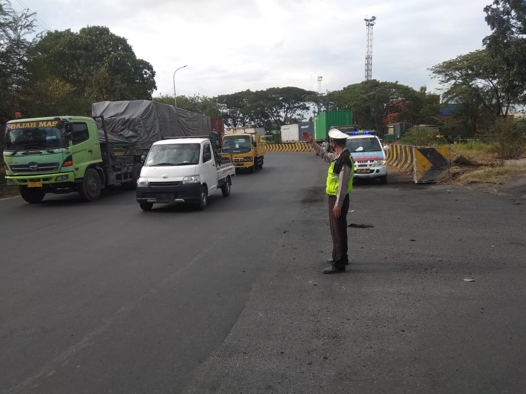 Seputarperak.com- Pengaturan lalu lintas dilakukan personil Unit Lantas Polsek Krembangan, Polres Pelabuhan Tanjung Perak di turunan tol, seputaran Jalan Tanjung Batu, Kamis sore, 12 Agustus 2021.