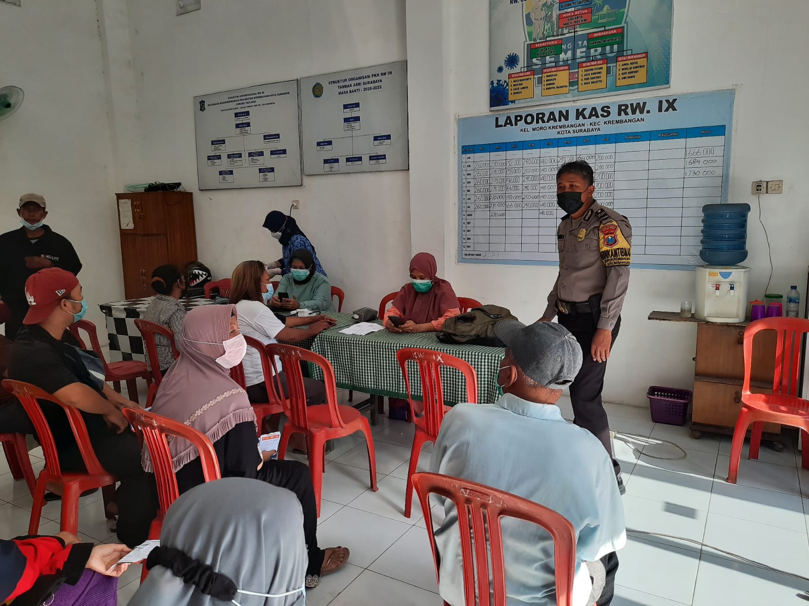 Seputarperak.com- Pengamanan vaksinasi dilakukan personil Polsek Krembangan, Polres Pelabuhan Tanjung Perak di Balai RW 09 Kelurahan Morokrembangan, Rabu, 18 Agustus 2021.