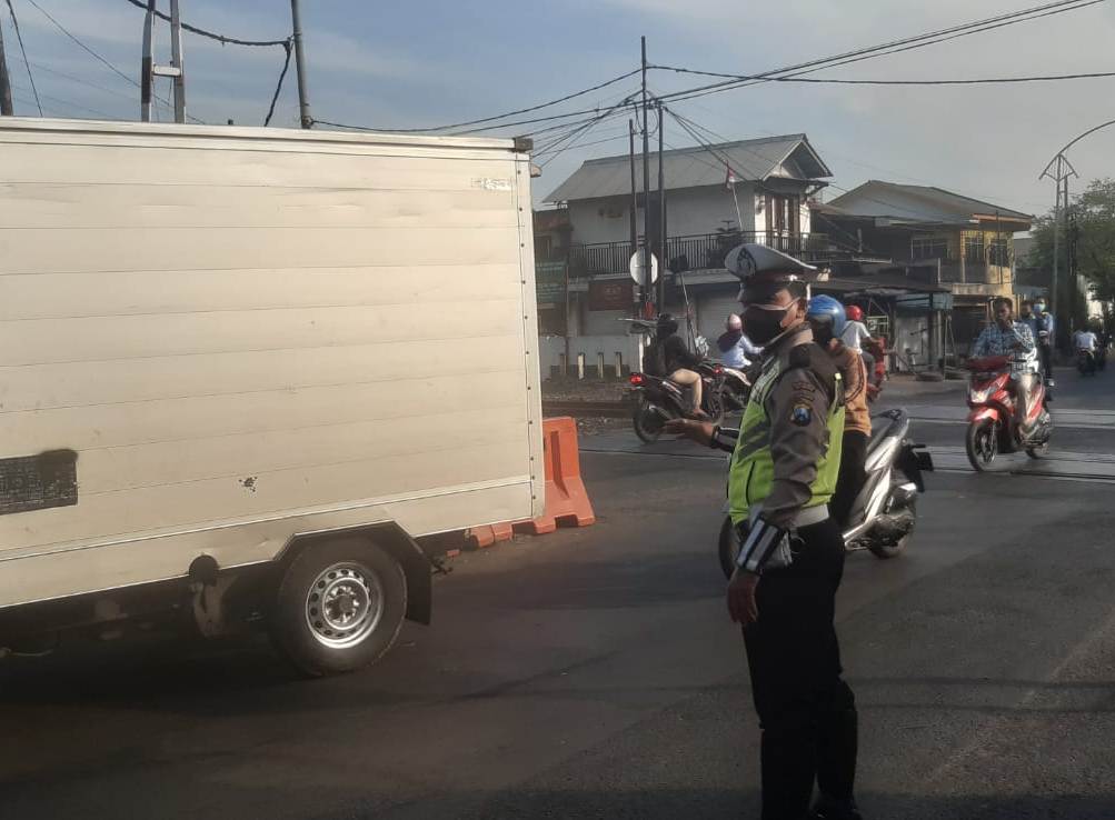 Seputarperak.com- Pengaturan lalu lintas dilakukan personil Unit Lantas Polsek Asemrowo, Polres Pelabuhan Tanjung Perak di Jalan Tambak Mayor, Senin pagi, 30 Agustus 2021.
