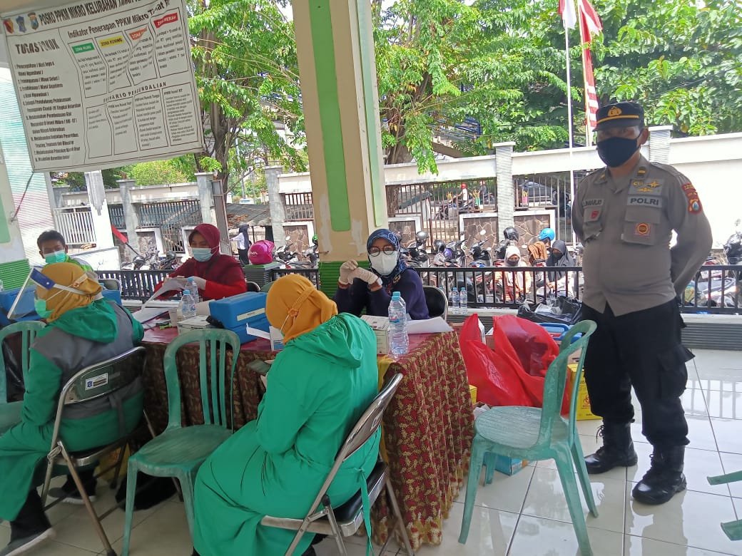 Seputarperak.com- Pengamanan vaksinasi dilakukan personil Polsek Kenjeran, Polres Pelabuhan Tanjung Perak di kantor Kelurahan Tanah Kali (Takal) Kedinding, Jalan HM Noer, Senin, 30 Agustus 2021.