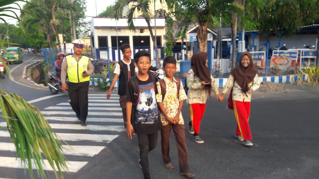 Disela-sela aktivitasnya melakukan pengaturan lalu lintas sore, personil Unit Lantas menyempatkan membantu anak-anak sekolah yang sedang menyeberang jalan.