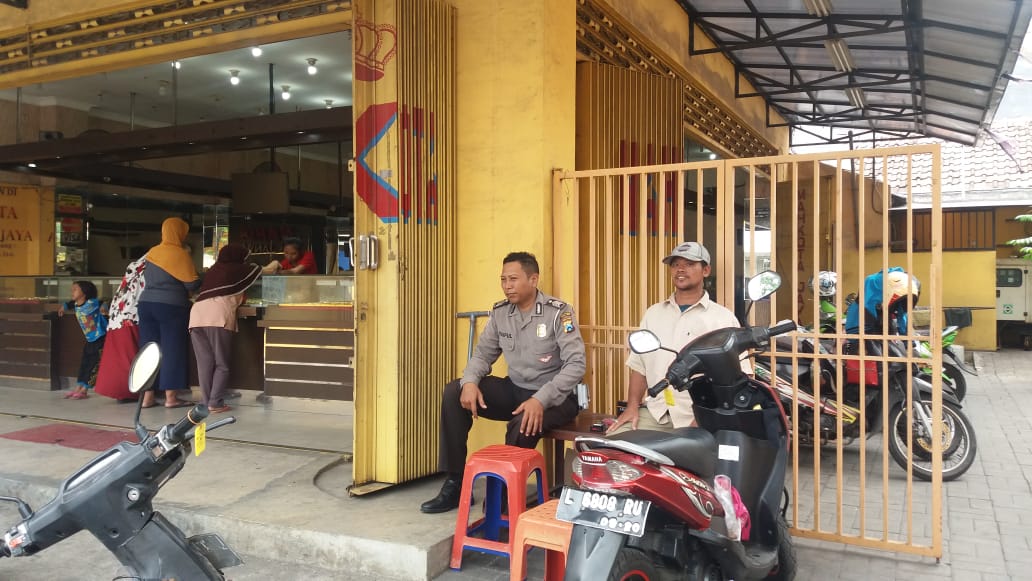 Dalam kunjungannya, personil Unit Lantas Polsek Kenjeran melakukan pemantauan sambil memberikan himbauan waspada kriminalitas kepada para karyawan dan pemilik toko mas Mahkota.