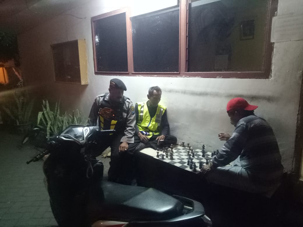 Setelah memastikan situasi tetap aman dan kondusif. personil Satsabhara menemui beberapa warga yang sedang nongkrong sambil bermain catur di pos kamling setempat.