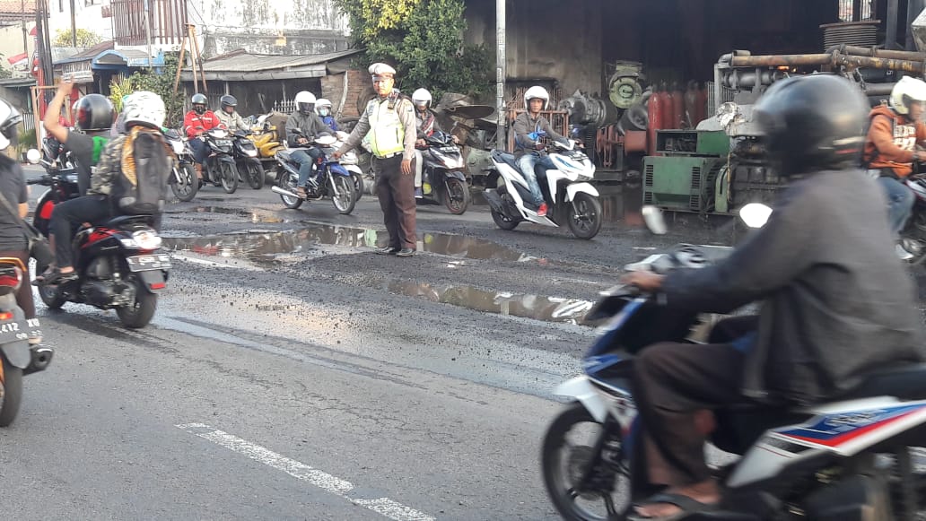 Untuk mencegah kecelakaan akibat jalan berlubang, personil Unit Lantas melakukan pengaturan di sekitar lokasi.