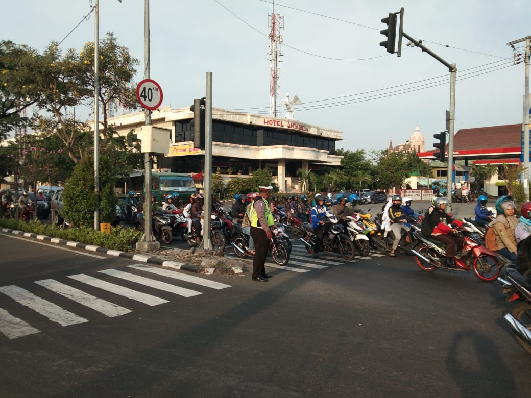 Salah satunya seperti yang dilakukan personil Unit Lantas di perempatan hotel Antariksa Jalan Gresik Gadukan, Kamis sore, 27 September 2018.
