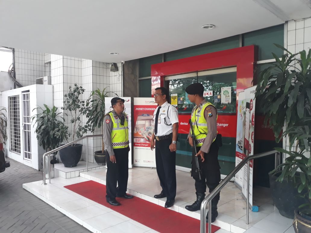 Seperti itu pula yang dilakukan Satsabhara Polres Pelabuhan Tanjung Perak, Selasa, 22 Mei 2018 di Bank Jatim Jalan Perak Timur.
