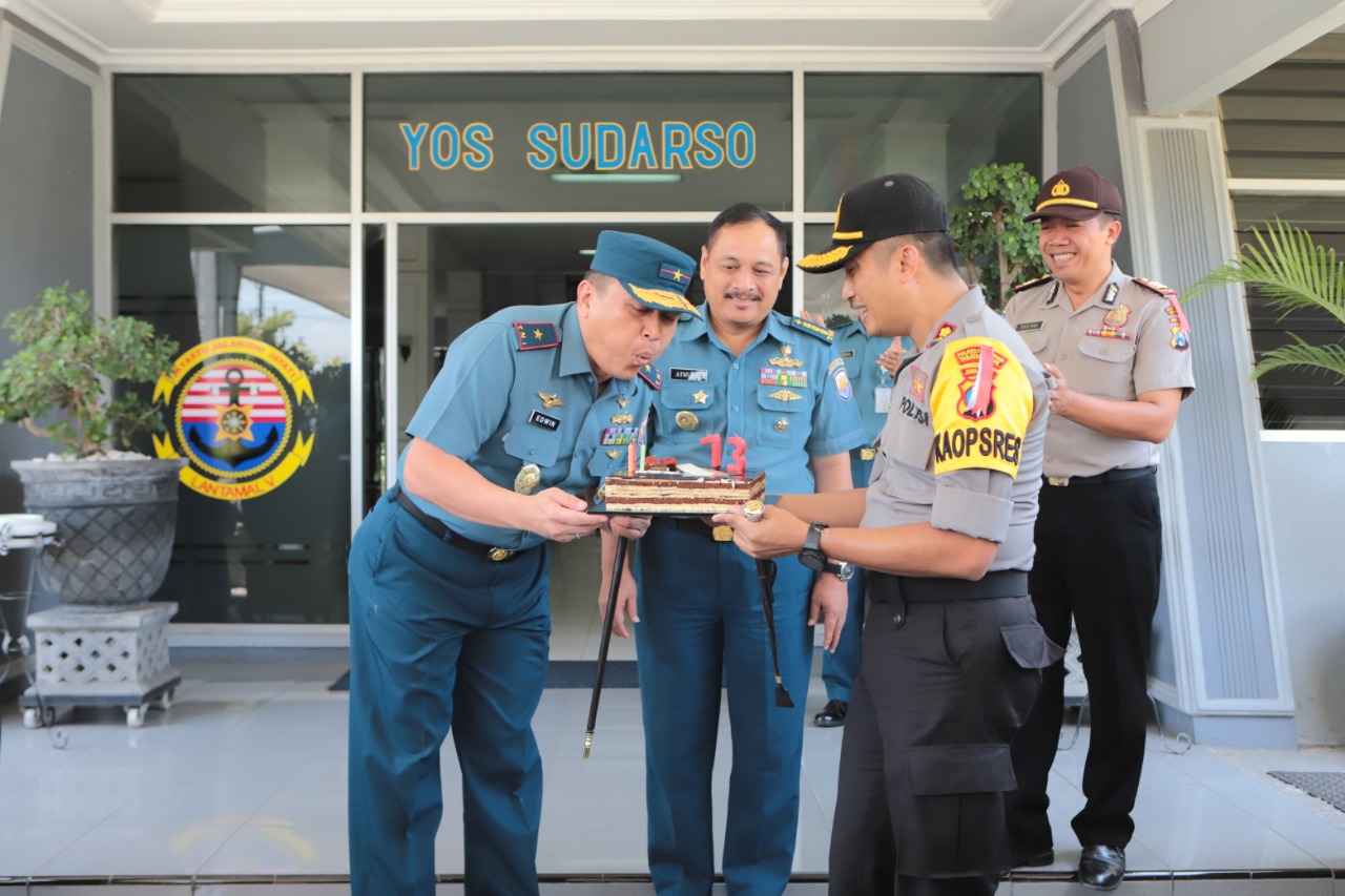Disini Kapolres menyerahkan kue ulang tahun lengkap dengan lilin berangka 73 kepada Laksamana Pertama Edwin, seraya mengucapkan harapannya, agar hubungan kedua belah pihak tetap harmonis seperti selama ini.