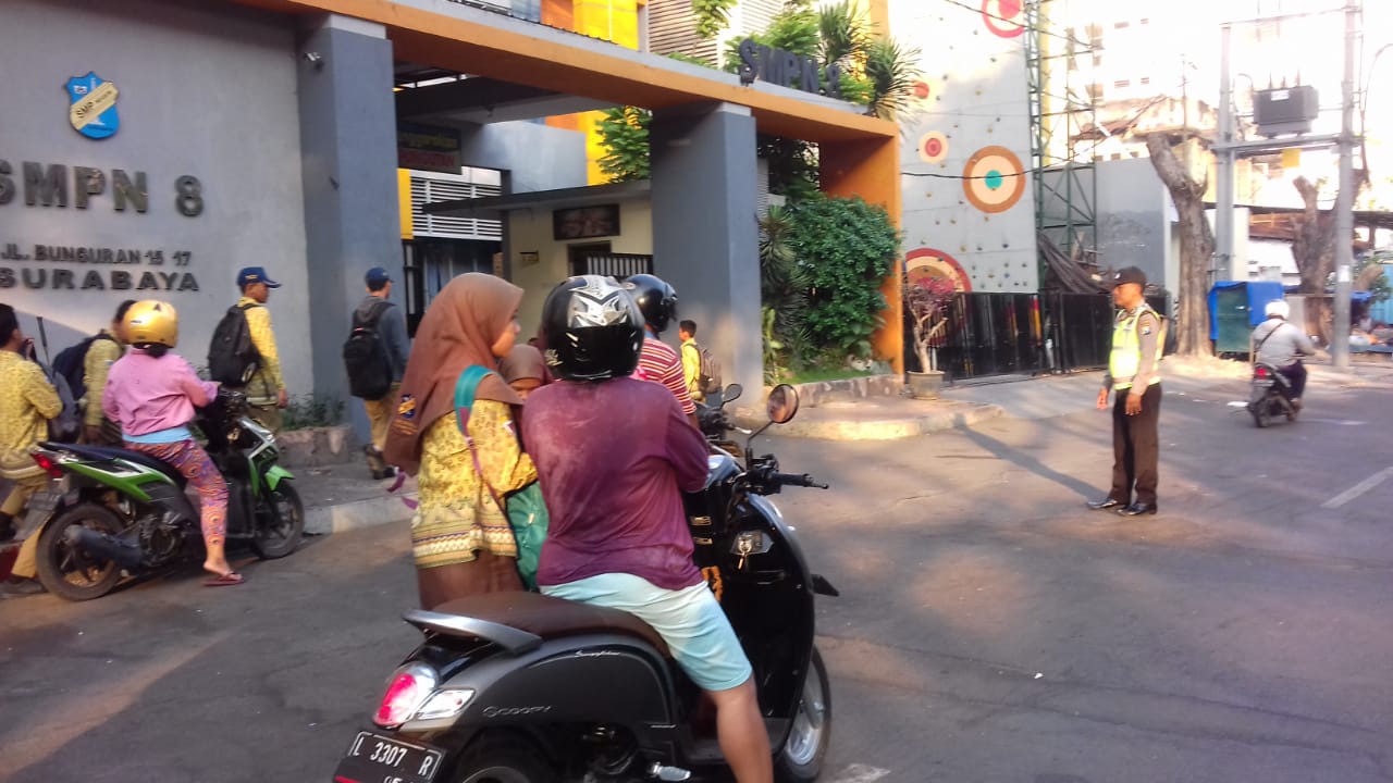 Seputarperak.com- Pengaturan lalu lintas pagi dilakukan Aiptu Made Suarthana, Babinkamtibmas Bongkaran, Polsek Pabean Cantikan, di depan SMPN 8 Jalan Bunguran, Jumatpagi, 12 Oktober 2018.