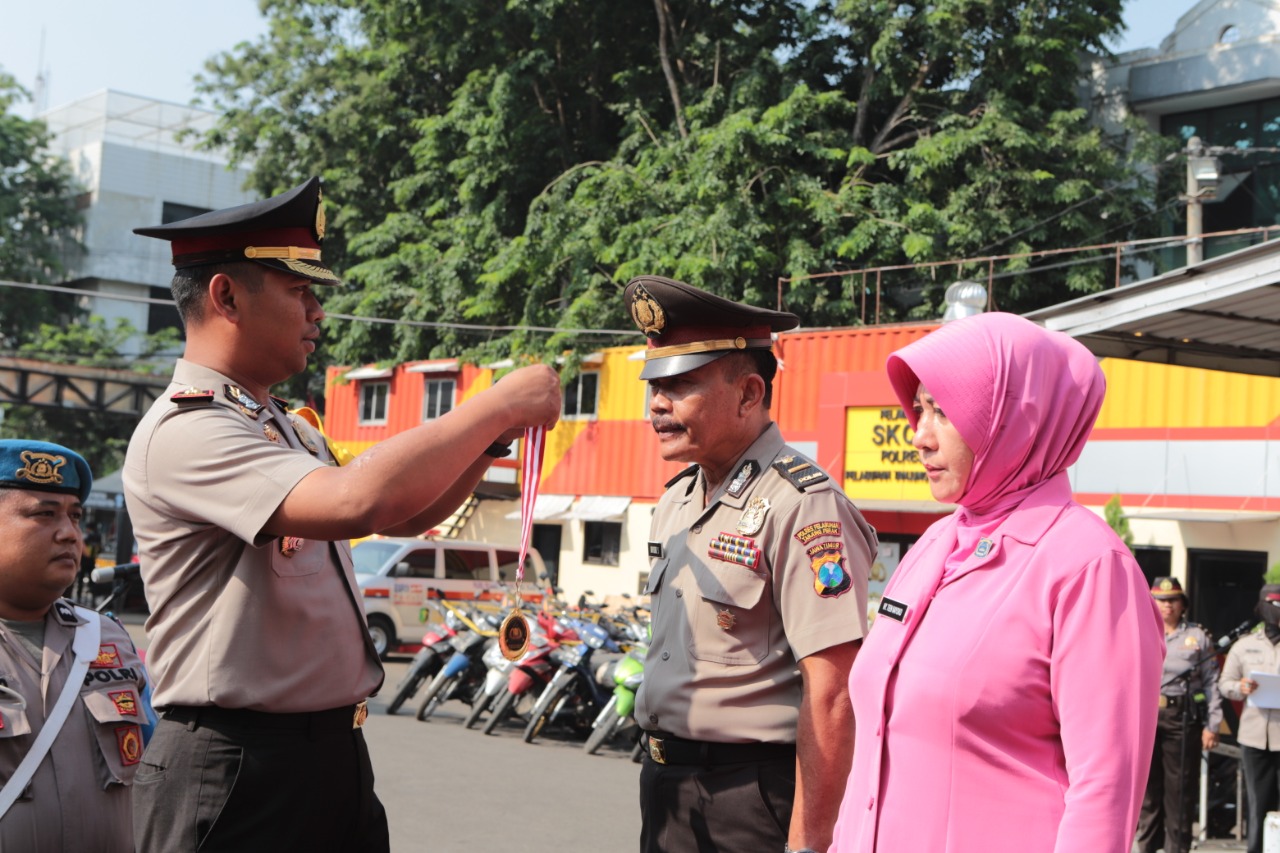 Usai upacara, Wakapolres menyempatkan memberi cindera mata berupa jam tangan, serta mengalungkan medali kehormatan kepada Ipda Nayoko Hadi.