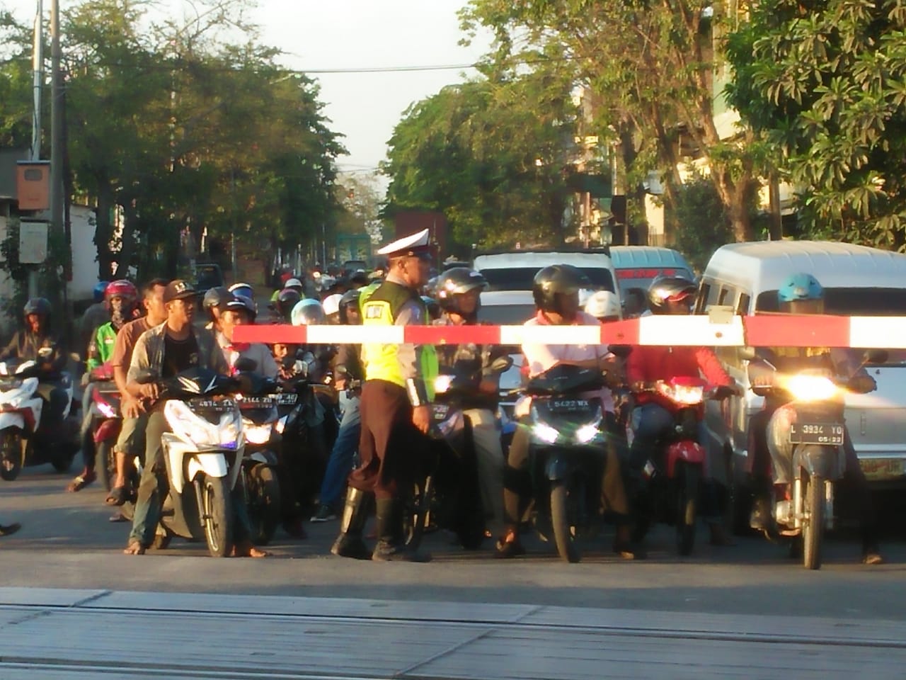 Personil Unit Lantas saat itu terlihat sibuk mengatur kepadatan lalu lintas, termasuk membantu melancarkan perjalanan kereta api serta mencegah para pengendara menerobos palang pintu perlintasan.