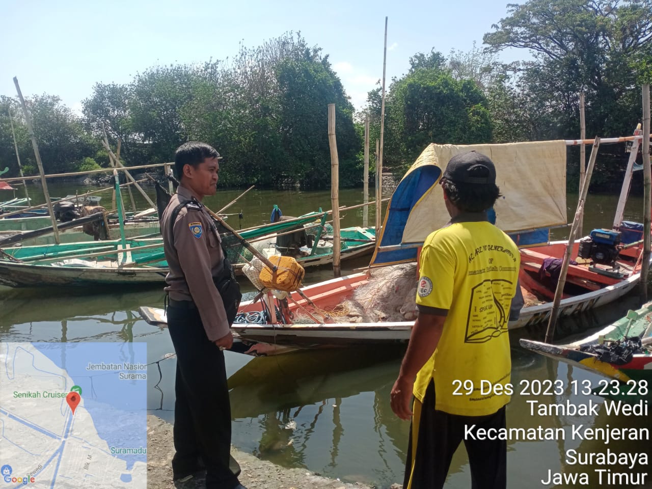 Seputarperak.com- Aipda Fardiyan, Bhabinkamtibmas Tambak Wedi, Polsek Kenjeran, Polres Pelabuhan Tanjung Perak, Polda Jawa Timur melaksanakan kegiatan sambang dan memberikan himbauan kepada para nelayan di Pos Ikan Kerapu, Jalan Tambak Wedi KMS, Jumat, 29 Desember 2023. Himbauan tersebut bertujuan untuk meningkatkan kesadaran akan pentingnya menjaga keselamatan saat melaut.