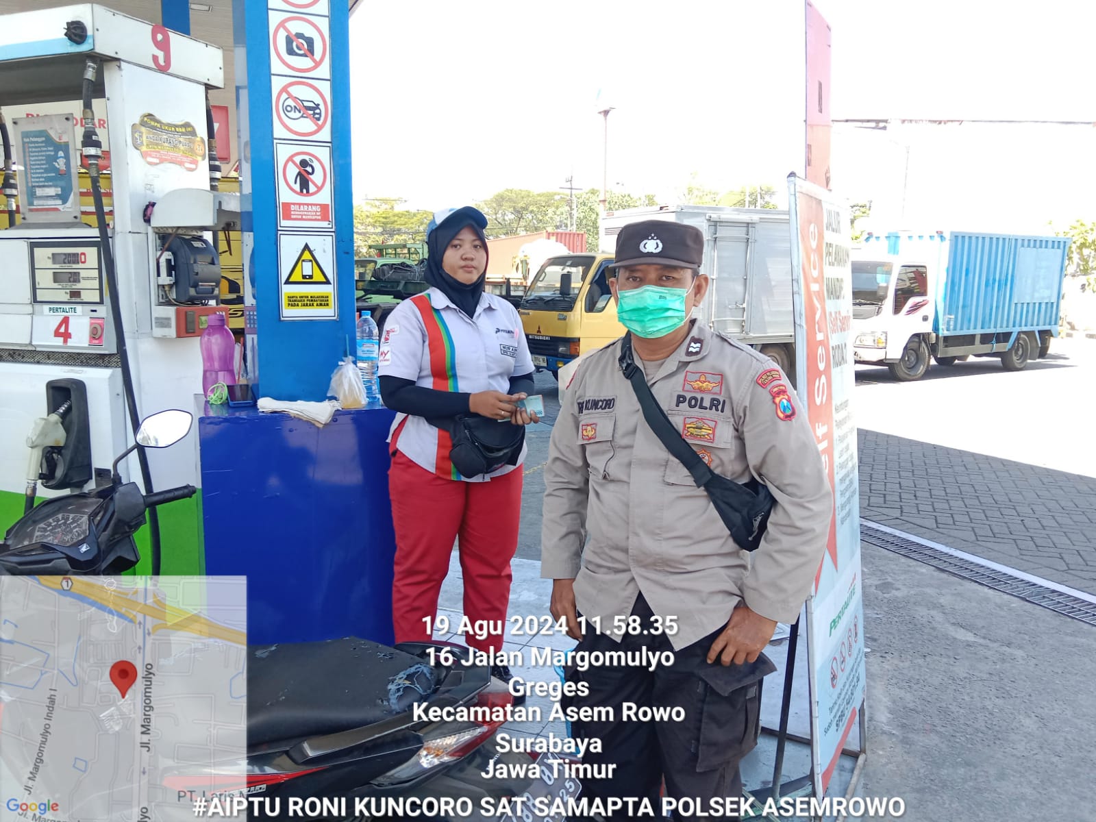 Seputarperak.com- Polsek Asemrowo melakukan patroli rutin untuk memantau situasi di sekitar SPBU Margomulyo No. 30 pada hari Senin, 19 Agustus 2024. Saat ini, stok bahan bakar minyak (BBM) dalam keadaan cukup melimpah, sementara situasi keseluruhan terlihat aman dan kondusif, tanpa adanya potensi kerawanan.
