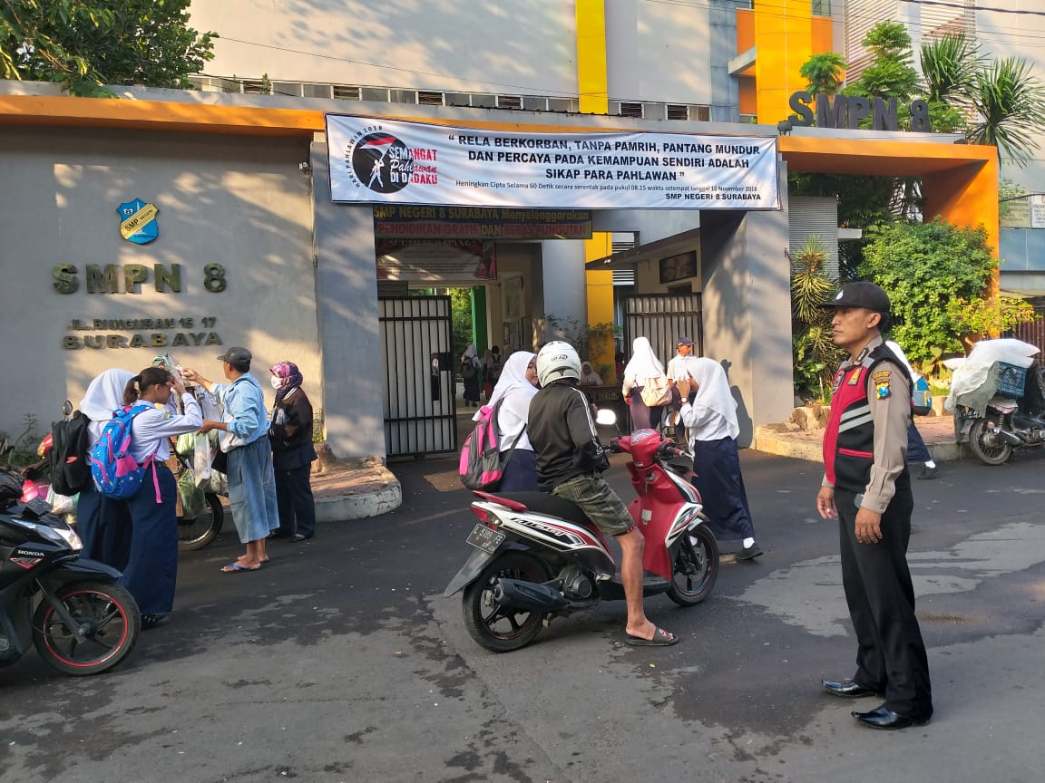 Seputarperak.com- Pengaturan lalu lintas pagi rutin dilakukan Aiptu Made Suarthana, Babinkamtibmas Bongkaran, Polsek Pabean Cantikan, Polres Pelabuhan Tanjung Perak di depan SMPN 8, Jalan Bunguran.