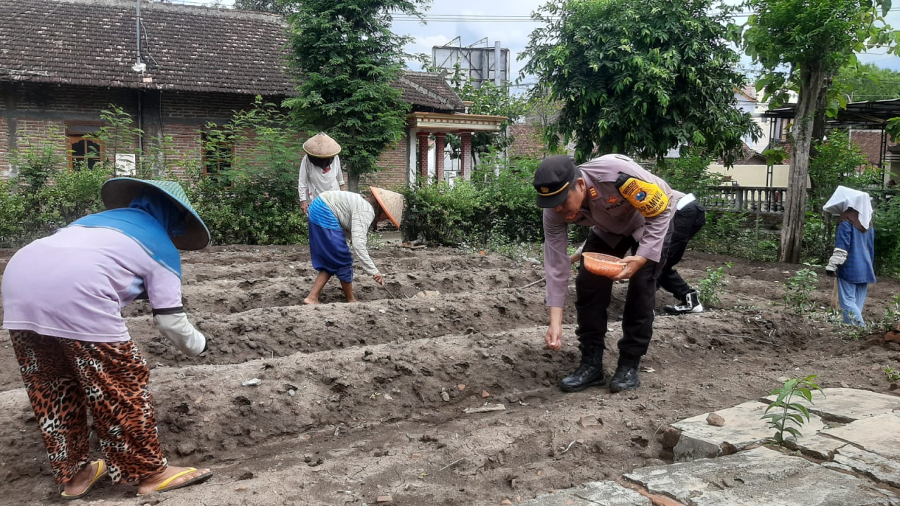 Dipimpin langsug Kapolsek Badegan, AKP Haryono bersama sejumlah anggota Polsek Badegan turut berpartisipasi dalam kegiatan penanaman benih jagung di Dukuh Badegan, Desa Badegan.