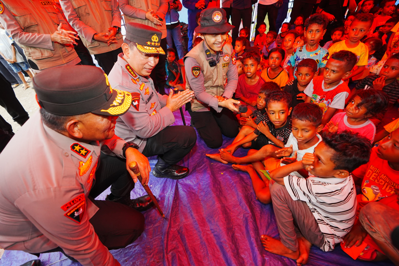 NTT - Kapolri Jenderal Listyo Sigit Prabowo mengunjungi posko pengungsian bencana erupsi Gunung Lewotobi Laki-laki, Nusa Tenggara Timur (NTT), Senin (18/11/2024)