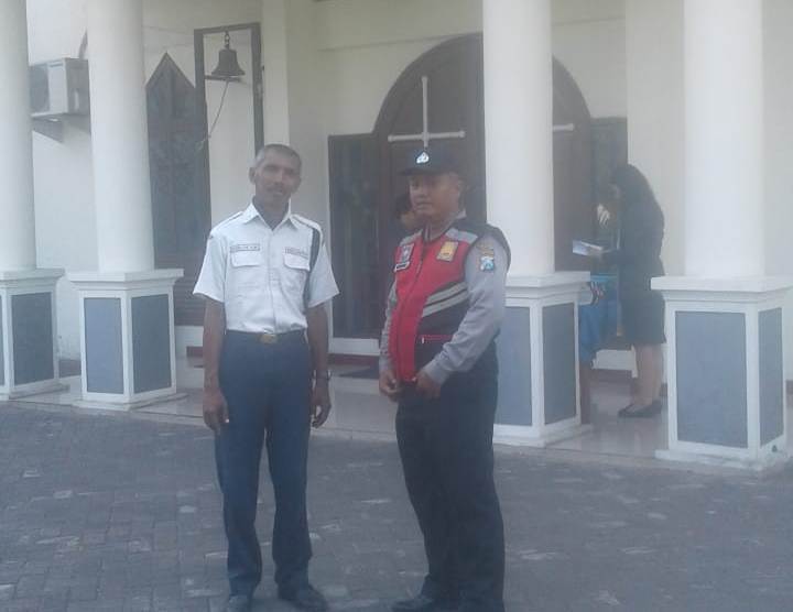 Seputarperak.com- Pengaman kebaktian di Gereja Bahtera Hayat di Jalan Laksda M Nazir dilakukan Aiptu.Heru Winarto, Babinkamtibmas Perak Utara, Polsek Pabean Cantikan, Minggu pagi, 18 Nopember 2018.
