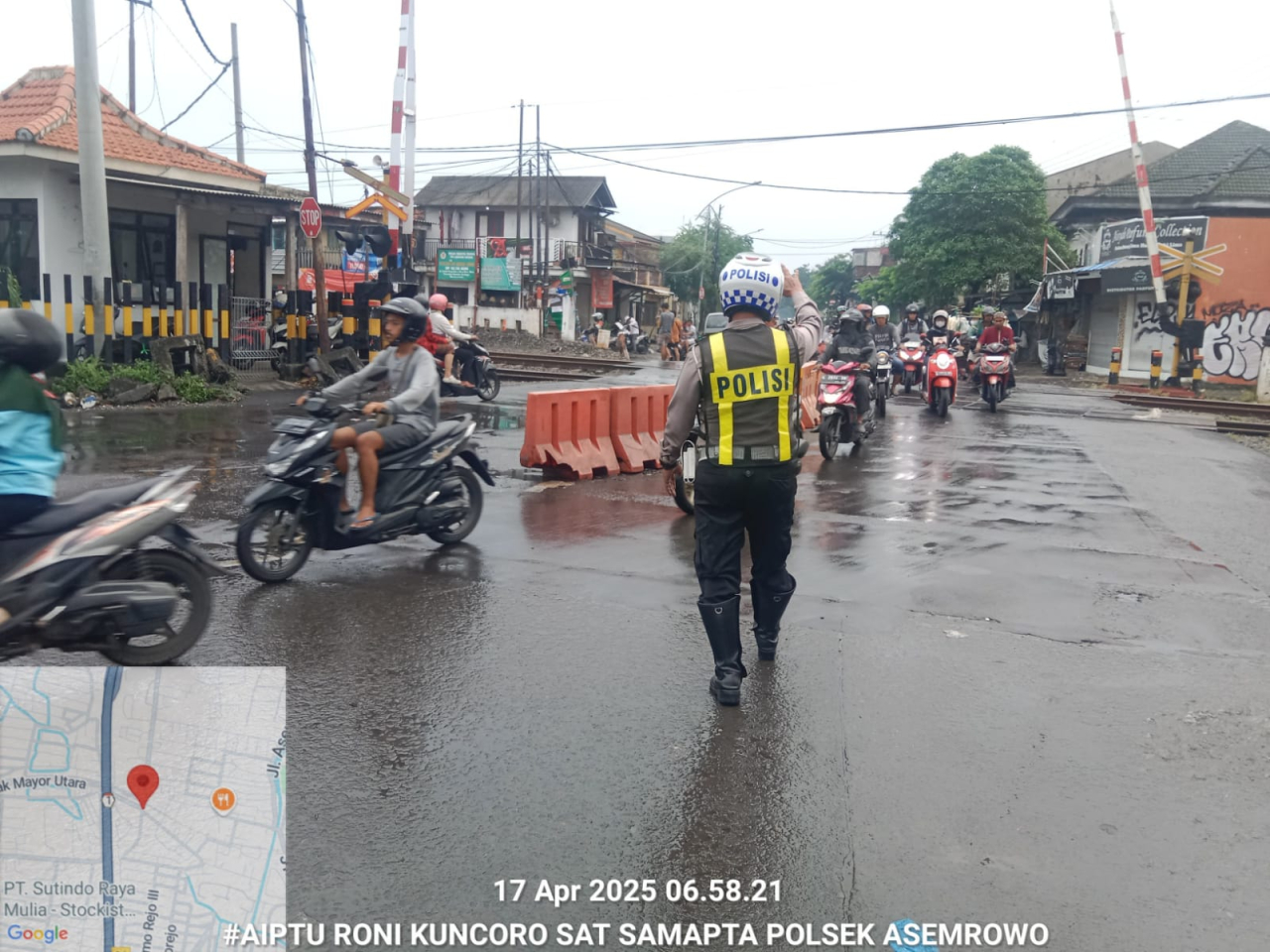 Kegiatan tersebut berlangsung pada Kamis, 17 April 2025, yang merupakan jam sibuk masyarakat beraktivitas, khususnya pengguna jalan yang melintas di perlintasan kereta api tersebut. Petugas tampak sigap mengatur lalu lintas serta membantu pengguna jalan agar tertib dan tidak menimbulkan kemacetan, terutama saat kereta melintas.
