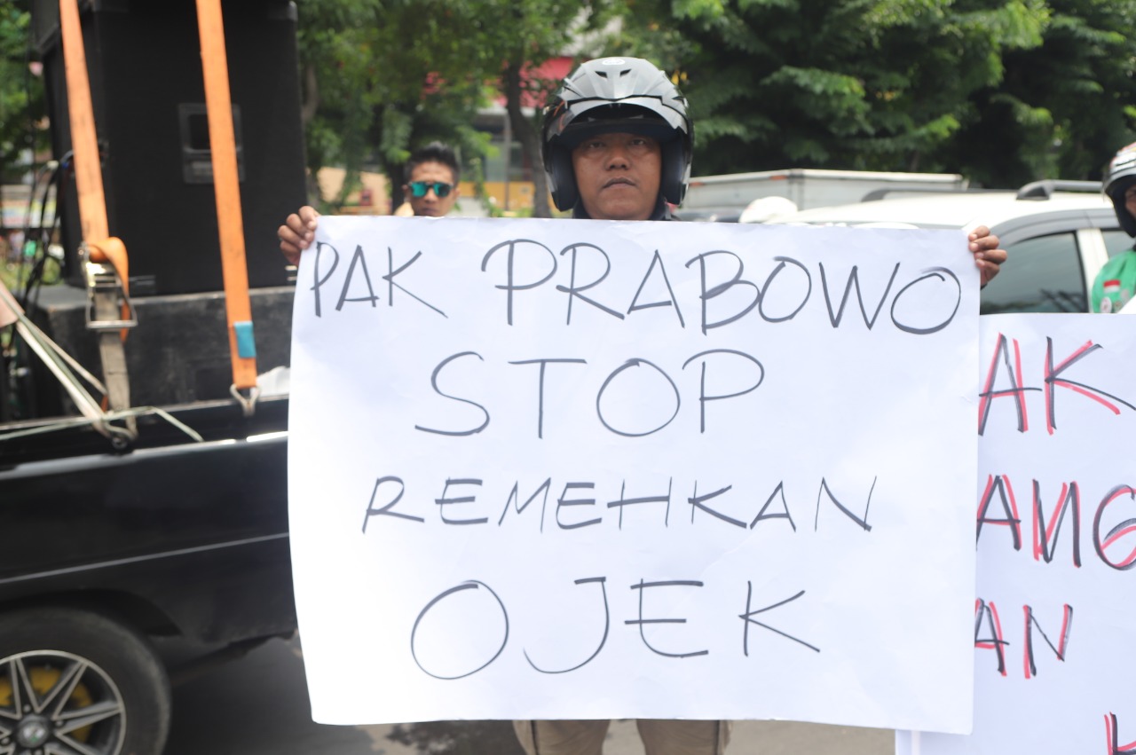 Para pengunjuk rasa ini menuntut agar Prabowo tidak lagi merendahkan profesi ojek dan meminta maaf secara langsung maupun melalui media massa selama 7 kali berturut-turut.