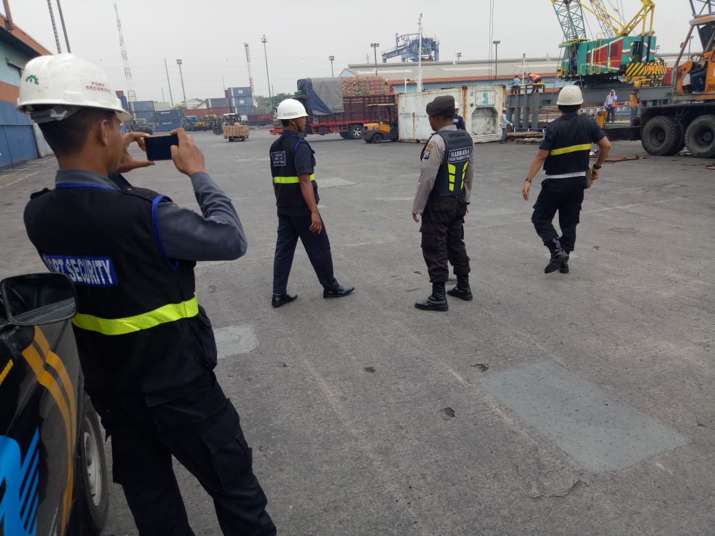 Dalam kegiatan ini personil Satsabhara dan petugas sekuriti Pelindo melakukan pemantauan di sekelling lokasi.