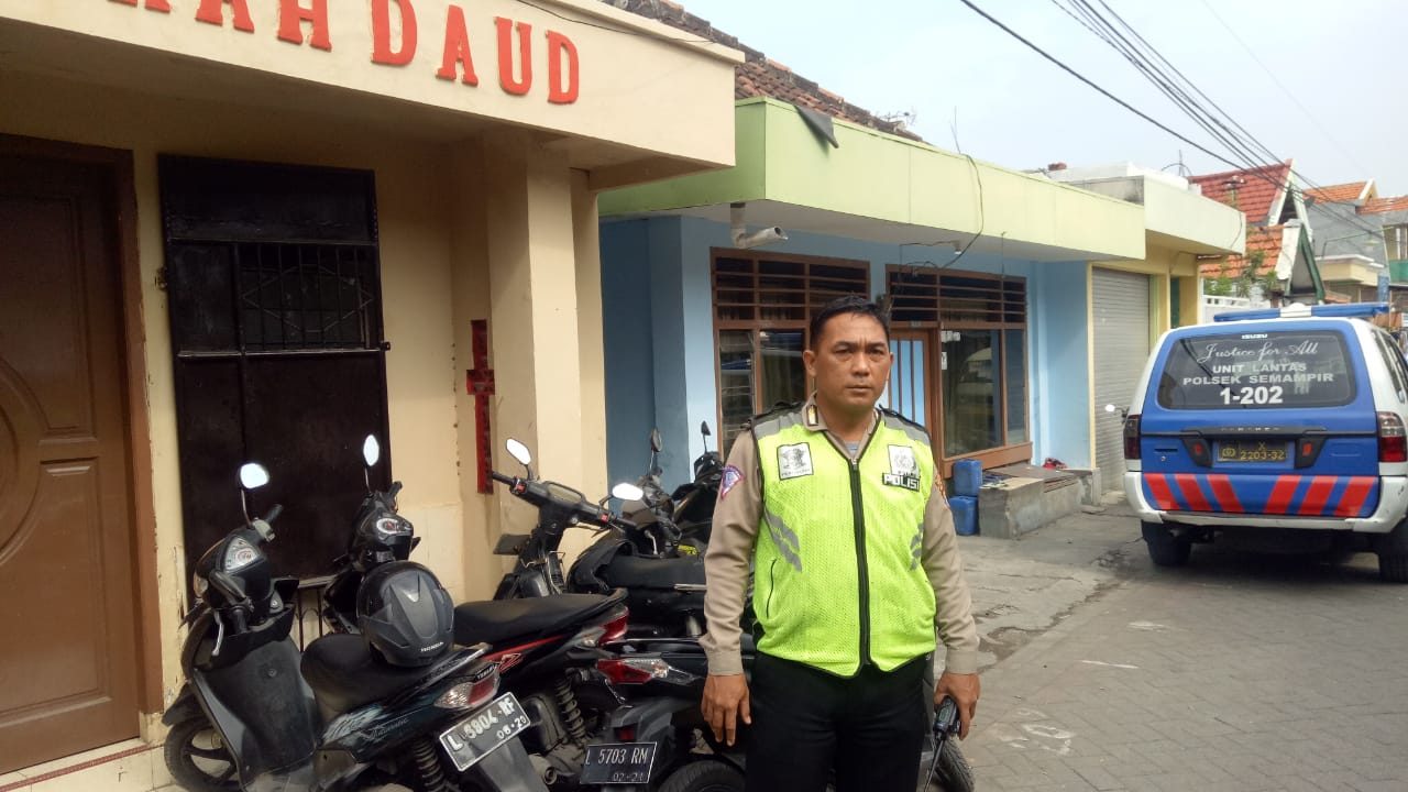 Seputarperak.com- Polsek Semampir, Polres Pelabuhan Tanjung Perak melaksanakan pengamanan kebaktian di Gereja GPID Jalan Jatisrono Tengah, Minggu, 2 Desember 2018.