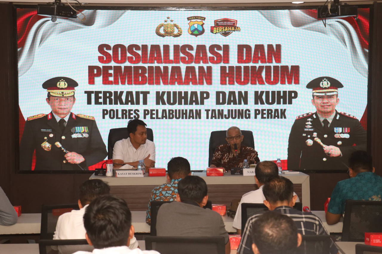 TANJUNG PERAK - alam upaya meningkatkan profesionalisme dan sinergitas penegakan hukum di wilayah hukum Pelabuhan Tanjung Perak, jajaran Satreskrim Polres Pelabuhan Tanjung Perak menggelar agenda krusial berupa Sosialisasi dan Pembinaan Hukum terkait Kitab Undang-Undang Hukum Pidana (KUHP) dan Kitab Undang-Undang Hukum Acara Pidana (KUHAP), Kamis (16/4/2026).