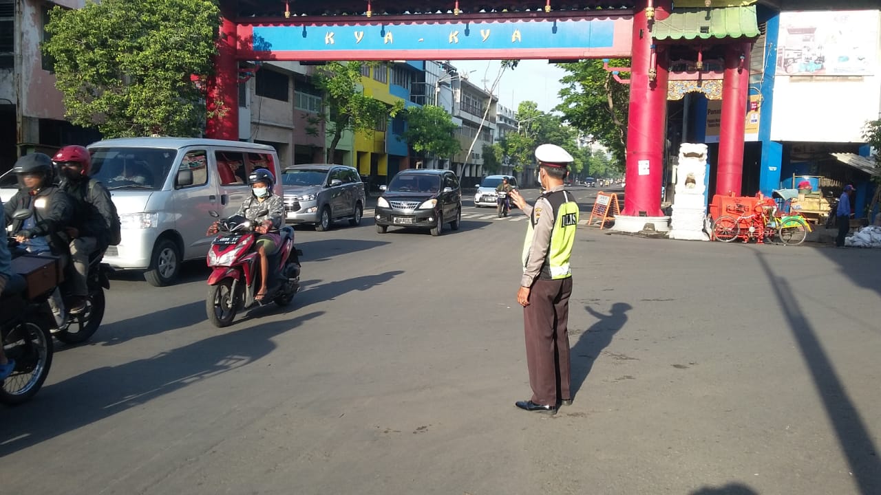 Seputarperak.com- Polsek Pabean Cantikan, Polres Pelabuhan Tanjung Perak melaksanakan pengaturan lalu lintas pagi di beberapa titik rawan macet di wilayahnya, Rabu, 5 Desember 2018. Diantaranya di seputaran Jalan Kembang Jepun.
