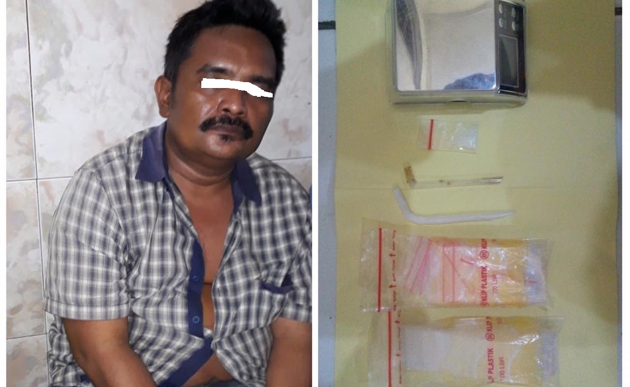 Dia dibekuk tanpa perlawanan dengan barang bukti satu bungkus poket sabu seberat 0,58 gram, dua pak plastik klip pembungkus sabu, satu sekrop plastik dari sedotan, satu buah timbangan elektrik, satu buah HP dan satu buah pipet kaca.