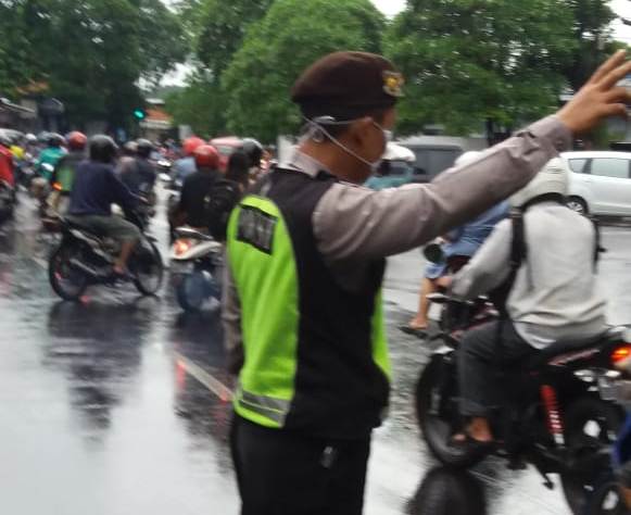 Cuaca mendung dan kondisi masih gerimis, tak membuat personil Polsek Krembangan kehilangan semangat untuk melaksanakan pengaturan.