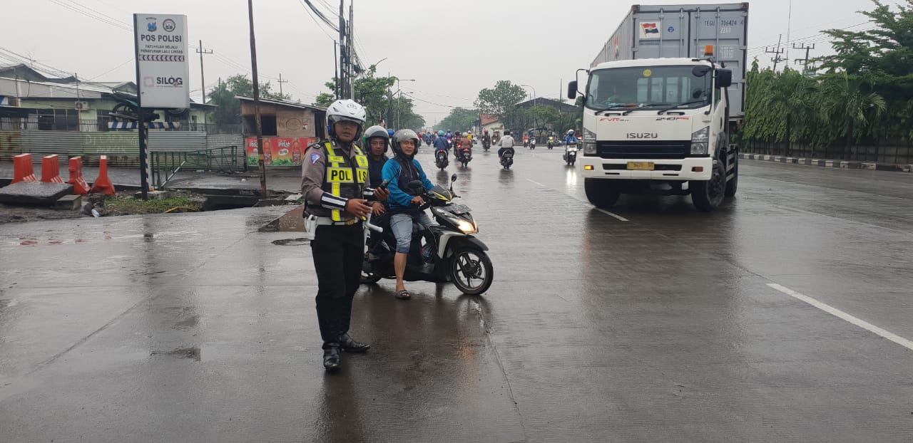 Pengaturan yang dimulai pada pukul 06.10 ini juga diisi himbauan kepada para pengendara motor, agar berhati-hati karena jalanan licin sehabis hujan.