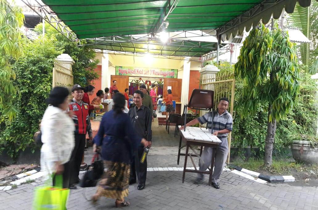 Seputarperak.com- Pengamanan kebaktian di Gereja Jawi Wetan, Jalan Siodotopo Wetan Indah, Kamis malam, 20 Desember 2018, dijaga Aiptu Tri Suhartono, Babinkamtibmas Sidotopo Wetan, Polsek Kenjeran, Polres Pelabuhan Tanjung Perak.