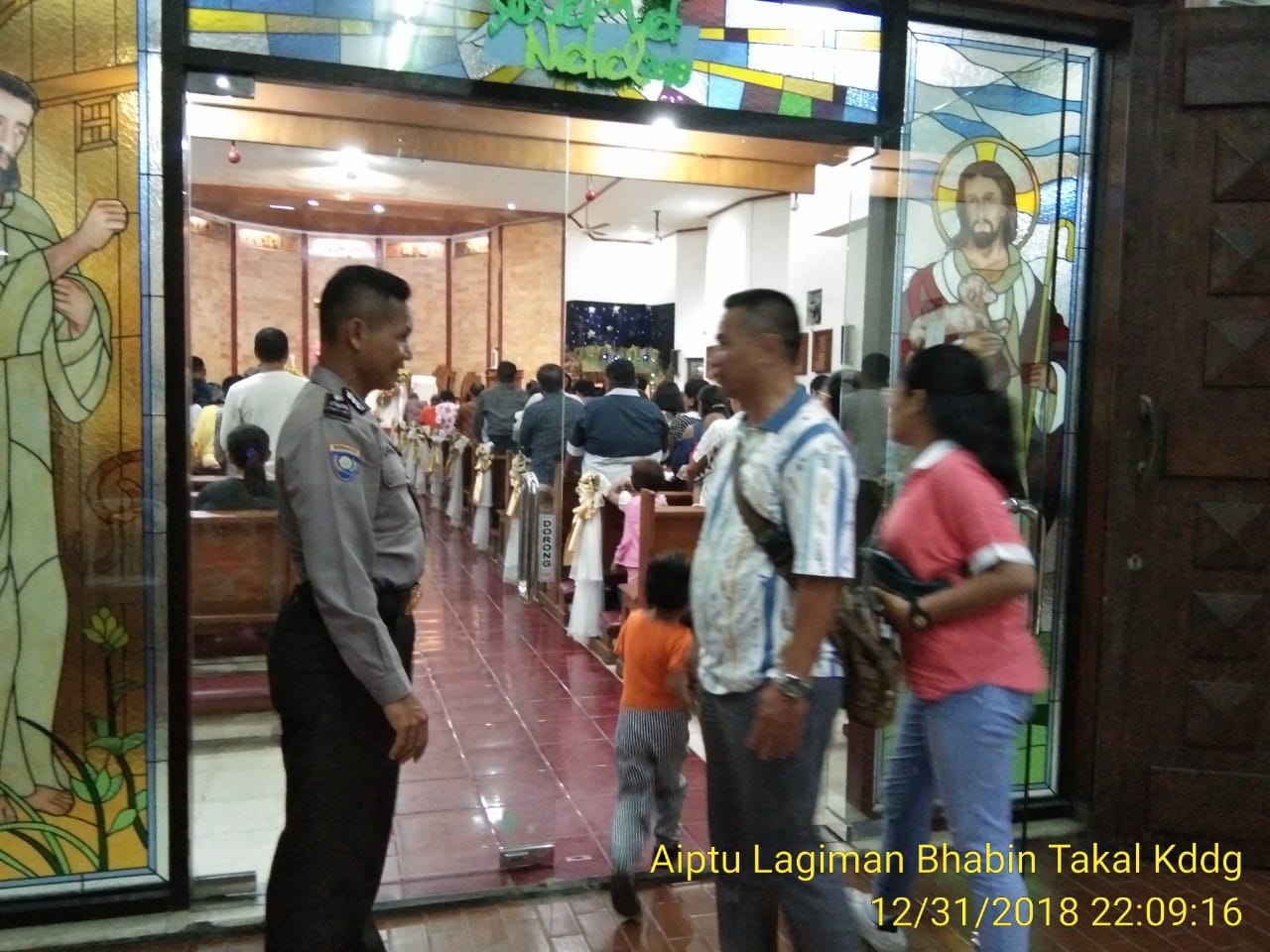 Seputarperak.com- Pengamanan kebaktian dilaksanakan Polsek Kenjeran, Polres Pelabuhan Tanjung Perak di Gereja Ratu Pecinta Damai di Jalan Pogot Baru, Senin malam, 31 Desember 2018.