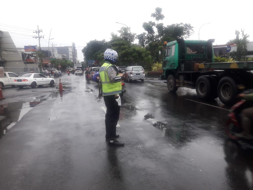 Meski ditengah guyuran gerimis, namun personil Satlantas Polres Pelabuhan Tanjung Perak tetap focus melaksanakan tugas pengaturan.