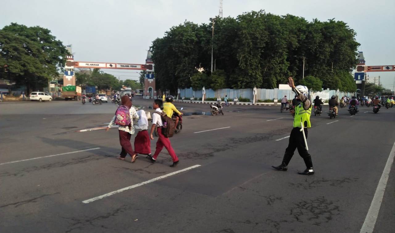 Selain mengatur lalu lintas pagi, personil Satlantas Polres Pelabuhan Tanjung Perak juga membantu menyeberangkan anak-anak sekolah.