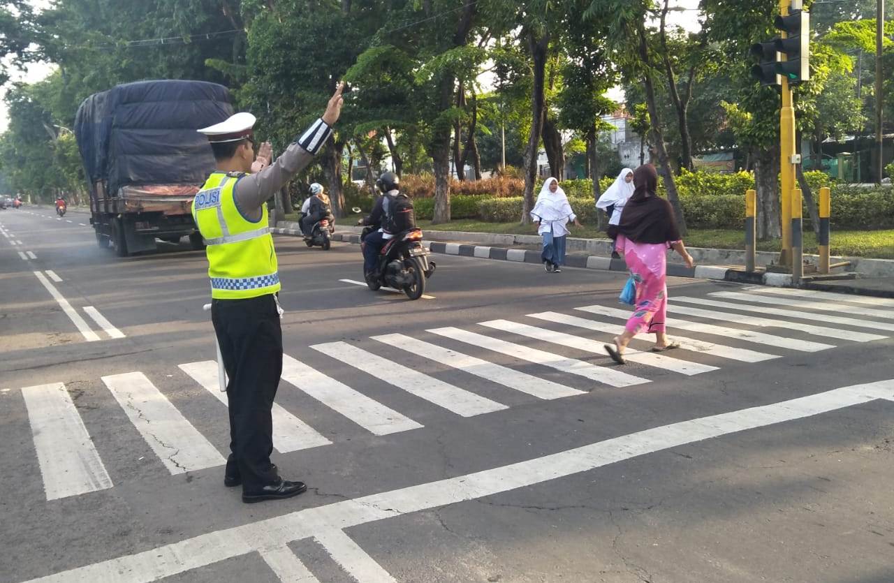 Pengaturan ini dilaksanakan personil Patwal dan anggota Polwan Satlantas, tepatnya di sekitar zebra cross.