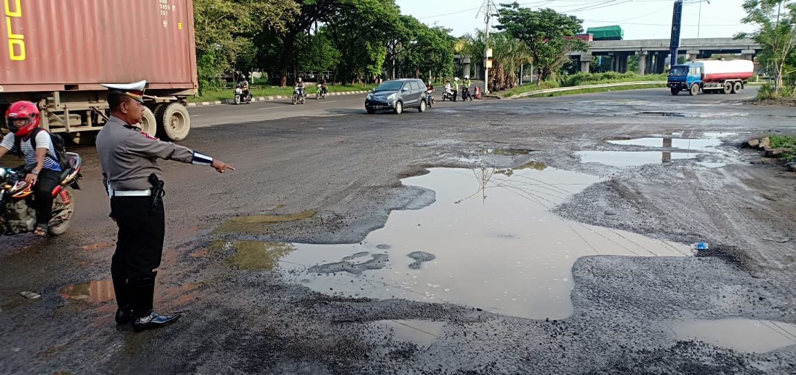Seperti yang dilakukan Iptu Sunarto, Kanit Turjawali Satlantas Polres Pelabuhan Tanjung Perak, saat melakukan pemantauan jalan rusak di kawasan depan PT Japfa Comfeed di Jalan Margomulyo, Selasa pagi, 15 Januari 2019.