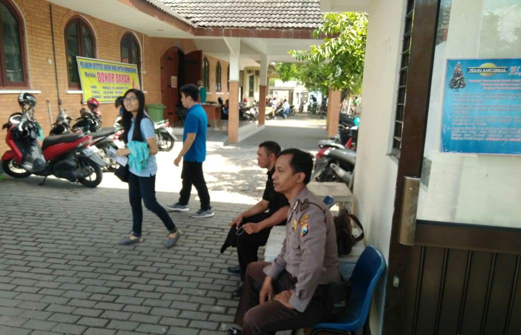 Seputarperak.com- Pengamanan dilakukan Aipda Dhanu Kriswana, Babinkamtibmas Sukolilo Baru, Polsek Kenjeran, Polres Pelabuhan Tanjung Perak di Gereja St Marinus di Jalan S Memet, Minggu pagi, 19 Januari 2019.