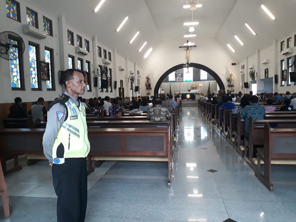 Pengamanan ini dilakukan Aiptu Sutris bersama petugas sekuriti gereja, untuk menjaga kelancaran kebaktian.