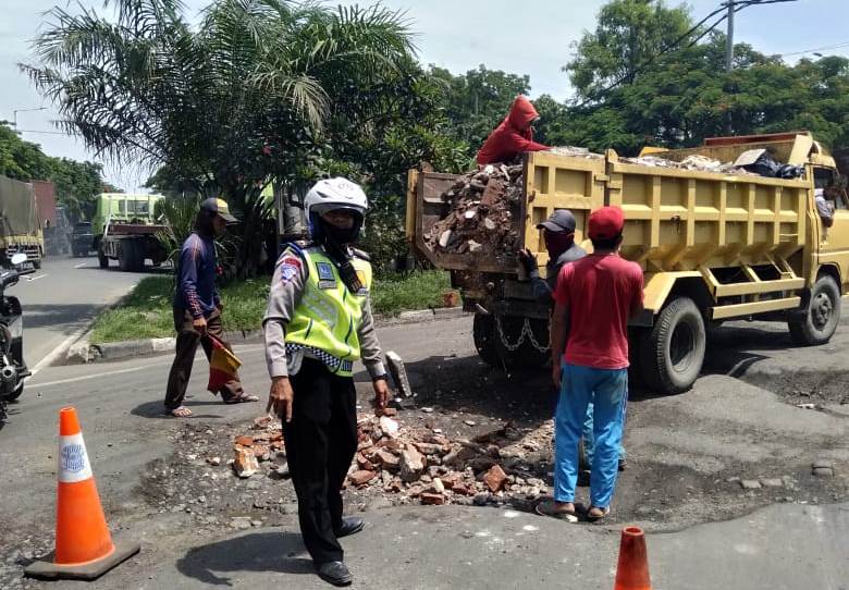 Kepada sopir truk, anggota Satlantas meminta sedikit bekas bongkaran bangunan yang tengah dimuat, untuk digunakan menguruk lobang di tempat ini.