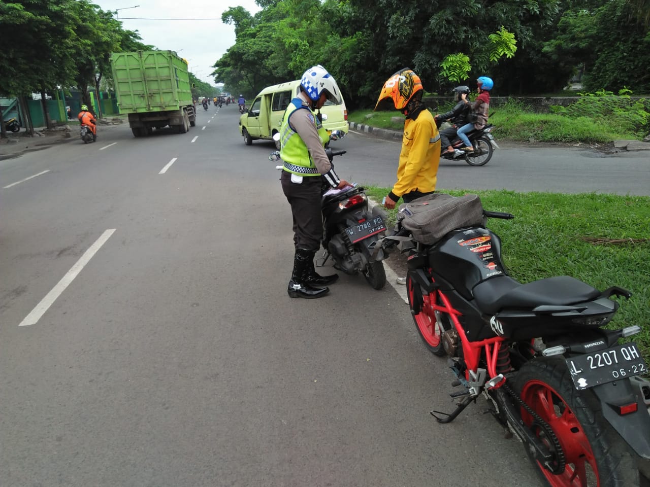 Diantaranya seperti yang dilakukan anggota Satlantas Polres Pelabuhan Tanjung Perak di seputaran Jalan Margomulyo, Senin sore, 11 Pebruari 2019.