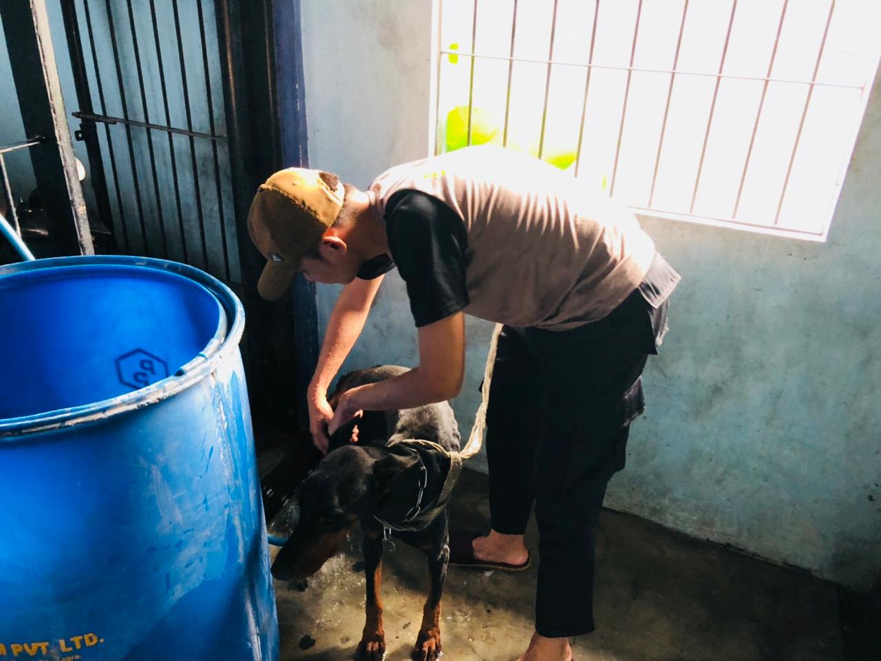 Seperti yang dilakukan Sabtu pagi, 16 Pebruari 2019, dimana anggota Unit Satwa Satsabhara memberikan sarapan pagi dan memandikan anjing pelacak peliharaannya.