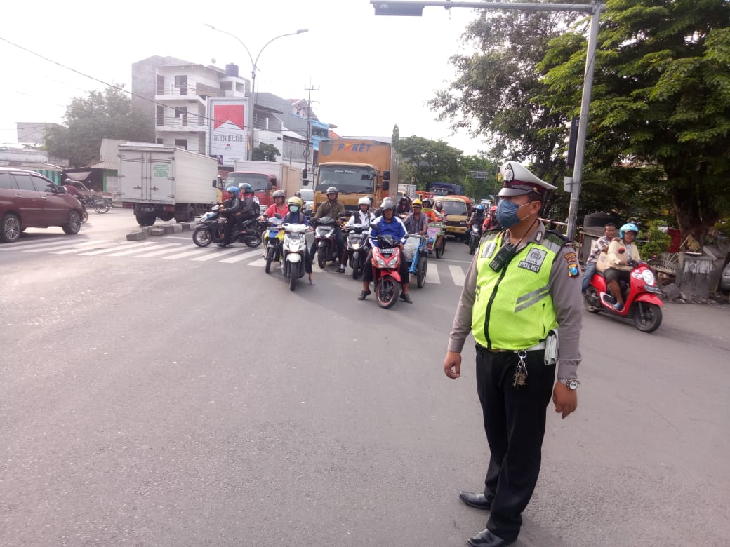 Selain melakukan pengaturan, personil Unit Lantas Polsek Semampir yang bertugas di lokasi, juga membantu menyeberangkan masyarakat.