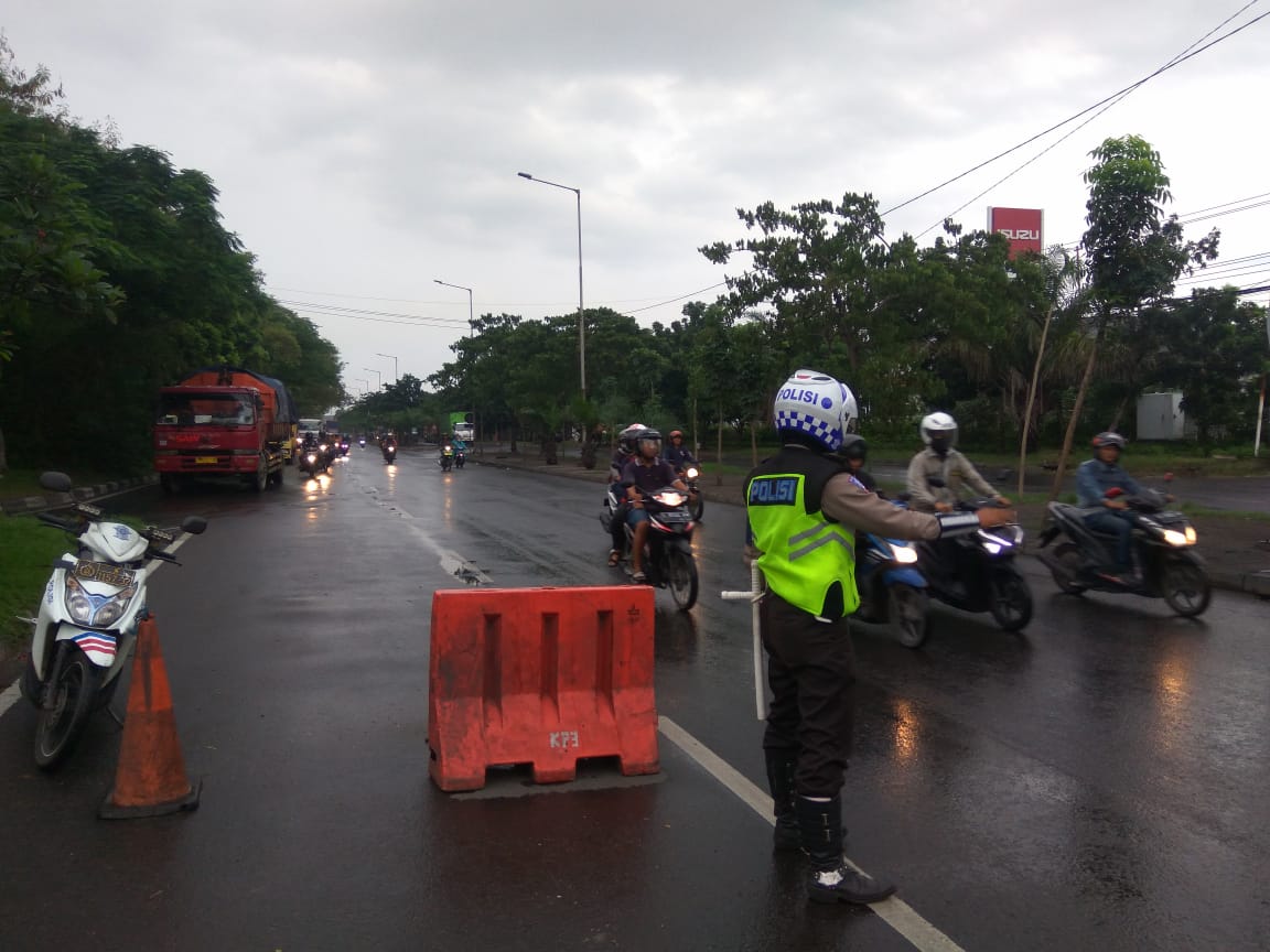 Meski di tengah cuaca gerimis, namun pengaturan tetap dilaksanakan anggota Satlantas dengan penuh semangat.