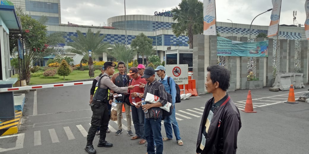 Saat itu personil Satsabhara membagikan brosur kepada masyarakat yang baru saja turun dari kapal, sambil menyampaikan perihal alasan penutupan sementara Jembatan Suramadu pada tanggal 17 Maret 2019 ini.