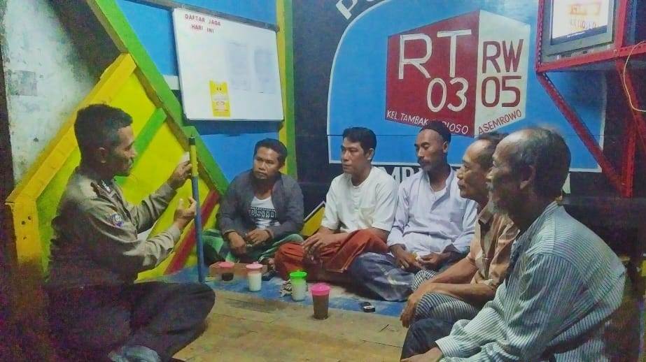 Seputarperak.com- Himbauan kamtibmas disampaikan Ipda Eko Mustaghfirin, Panit Binmas Polsek Asemrowo, Polres Pelabuhan Tanjung Perak kepada warga Tambaksarioso RT 03 RW 05 yang sedang melaksanakan kegiatan siskamling, Senin malam, 18 Maret 2019.