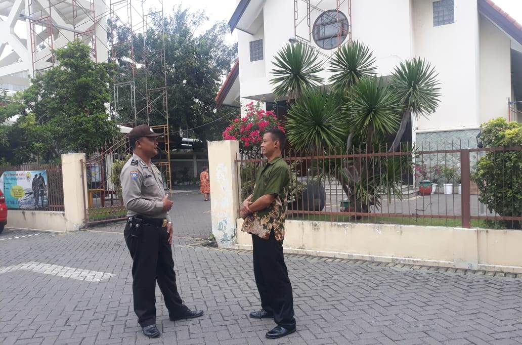 Seputarperak.com- Pengamanan kebaktian di Gereja Santo Mikael, Jalan Tanjung Sadari, dilaksanakan Polsek Krembangan, Polres Pelabuhan Tanjung Perak, Minggu pagi, 24 Maret 2019.