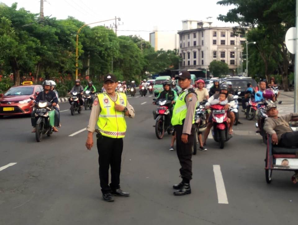 Seputarperak.com- Pengaturan lalu lintas sore dilaksanakan Polsek Pabean Cantikan, Polres Pelabuhan Tanjung Perak, Minggu, 24 Maret 2019 di seputaran Jalan Bunguran.