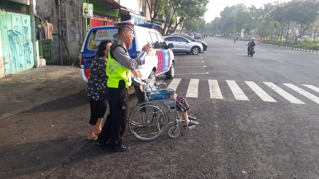 Selain melakukan pengaturan, personil Unit Lantas juga membantu menyeberangkan warga yang berada di sekitar lokasi.