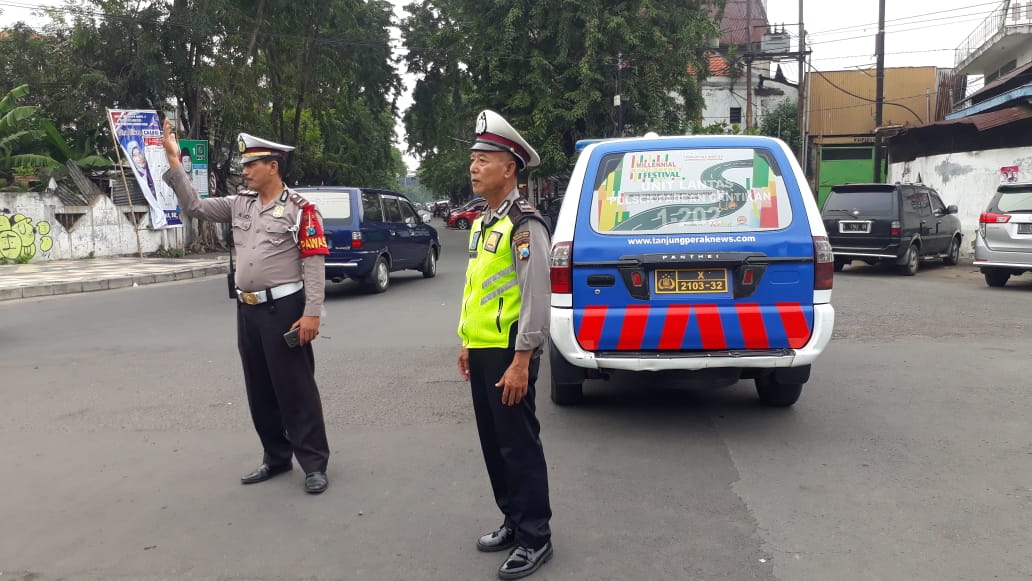 Seputarperak.com- Pengaturan lalu lintas sore dilakukan personil Unit Lantas Polsek Pabean Cantikan, Polres Pelabuhan Tanjung Perak di perbatasan Jalan Bunguran-Jalan Waspada, Minggu, 7 April 2019.